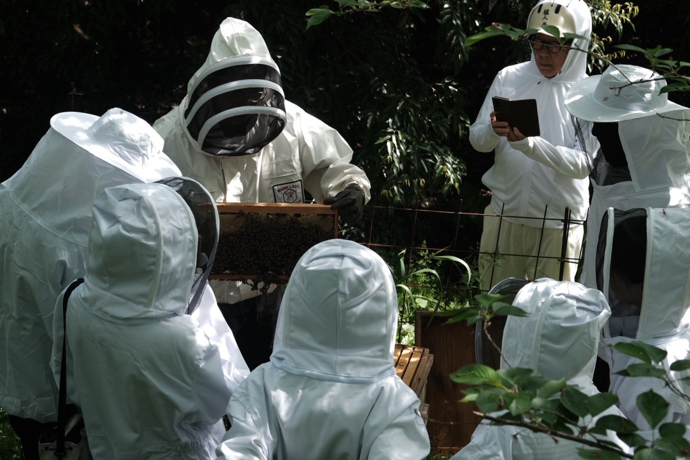 防護服に身を包み、静かに養蜂場へ。